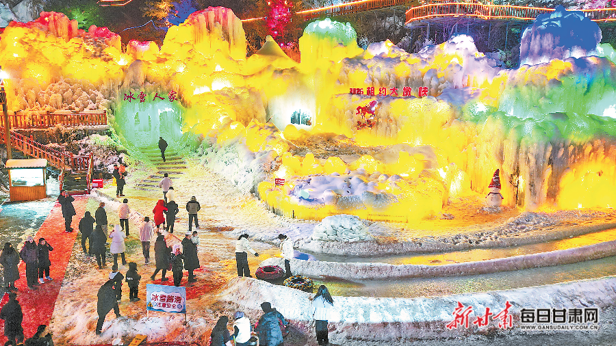 十二月二十三日,积石山县大墩峡景区内的冰瀑、冰挂等景观流光溢彩,美轮美奂的冰雪世界吸引游客前来赏景游玩。 新甘肃·甘肃日报通讯员 史有东