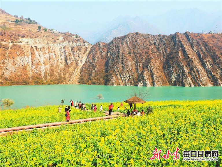一月十一日,文县玉垒乡玉垒坪村金灿灿的油菜花吸引游客前来赏景打卡。新甘肃·甘肃日报通讯员 后斌玉