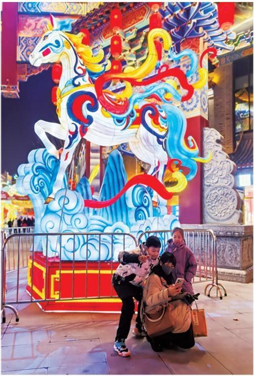 文化地标下的厚重年味更是值得回味。各大博物馆里的“马明星”们跨越千年,成了顶流。铜奔马踏燕凌空,带着汉代的风驰电掣;东晋木马憨拙古朴,静守着丝路的岁月沉淀。它们在展厅里与今人相逢,让文物里的龙马精神,化作马年最生动的吉祥注脚。白塔山下,人流如织,马年主题花灯与古建筑相映成趣,红灯笼高悬廊下,市民穿梭其间,感受着传统年俗与自然景致的交融。夜晚的兰州老街流光溢彩,马形花灯熠熠生辉,色彩斑斓的灯带勾勒出骏马奔腾的模样,传统建筑与现代灯光交相辉映,让文化地标成为年味最浓的打卡地。