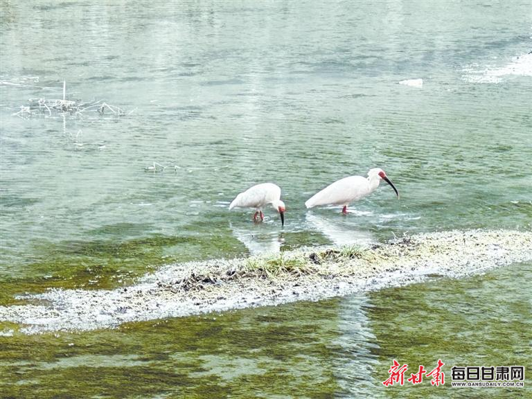 时而低头啄食、时而相互依偎、时而静立凝望……日前,几只被誉为“东方宝石”的国家一级保护动物朱鹮,悄然现身陇南康县云台河畔。它们通体洁白如雪,姿态闲适安然,羽翼在微风中轻颤,与倒映在碧波中的身影相映成趣。这幅人与自然和谐共生的美好画面,正是陇南市深入践行“绿水青山就是金山银山”理念,以生态之笔绘就发展长卷的真实写照。