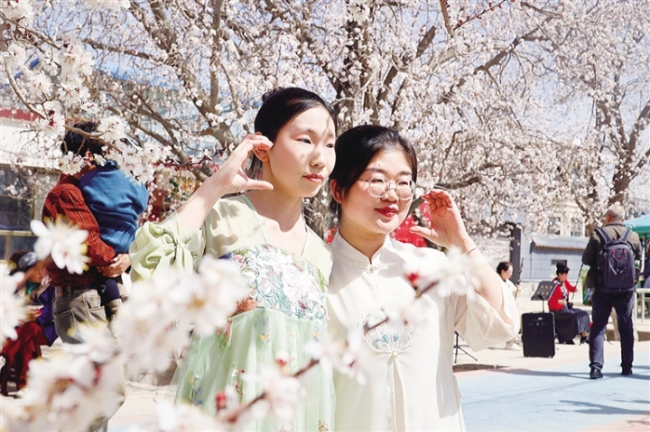 在红光村杏花街西入口到东广场,处处充满了欢声笑语。目之所及,灼灼杏花缀满枝头,街巷间彩旗飘扬,农特产品展示区、手工美食坊、展演舞台依次排开,吸引了众多游客。