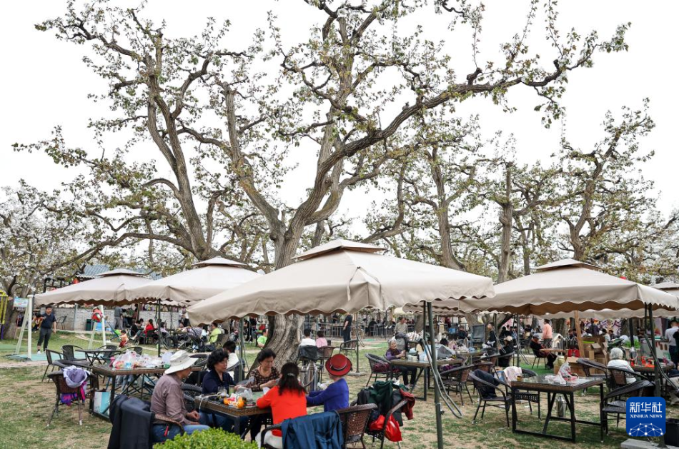 4月11日,游客在甘肃省兰州市皋兰县什川镇百年梨园内休闲游玩。