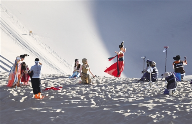 大漠黄沙,驼铃悠扬,月牙泉碧波荡漾,千年敦煌的丝路风情,如今在镜头下焕发出全新活力。在鸣沙山月牙泉景区,一场以大漠飞天、西域风情为核心的旅拍热潮持续升温,从日出到日落,在沙丘之上、泉边湖畔,随处可见身着古风服饰的游客在摄影师的镜头下定格专属大片。旅拍已成为景区最亮眼的文旅新风景。